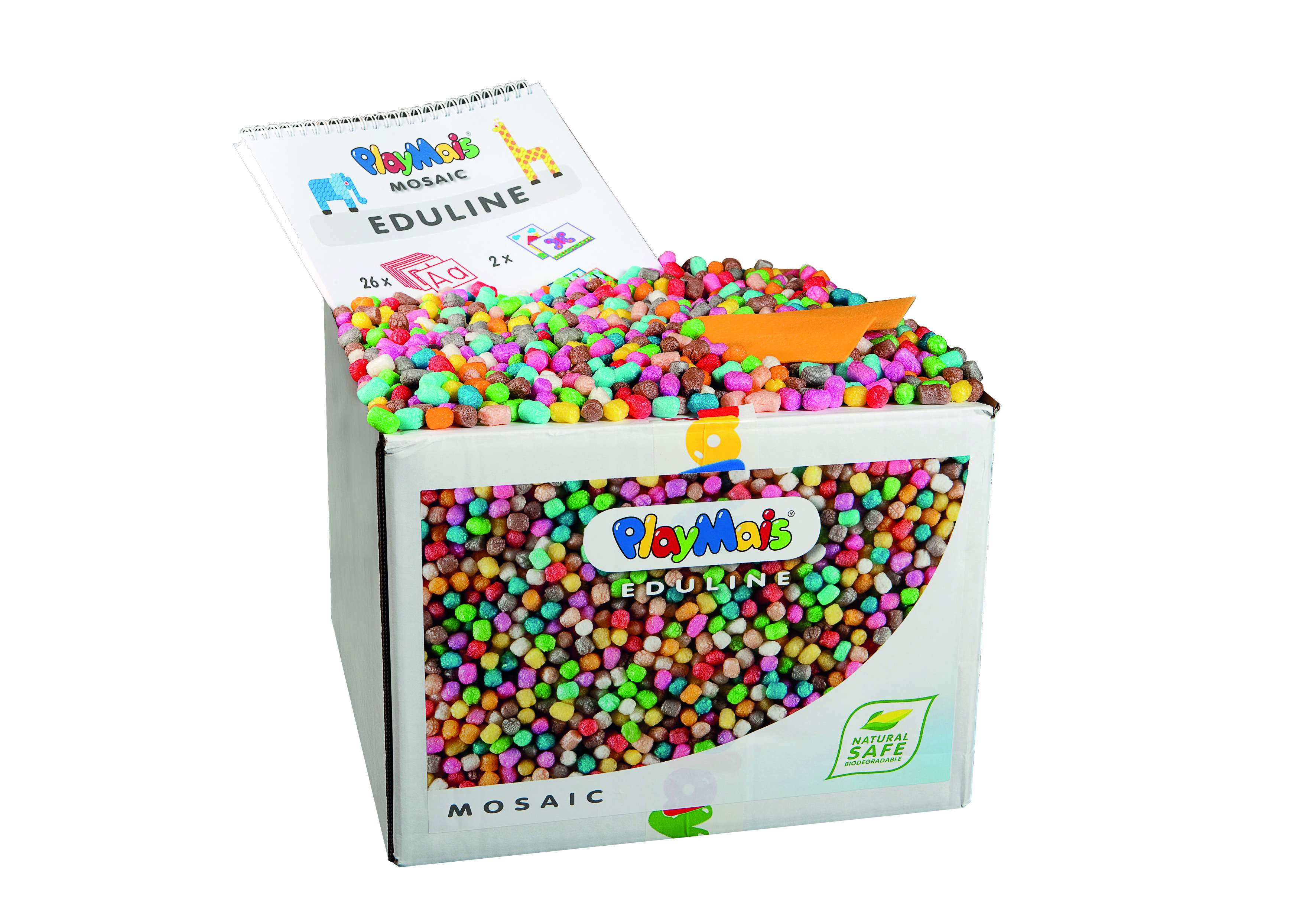 Playmais mosaico confezione scuola: è un gioco ecologico, biodegradabile al 100% che sostiene l'ambiente! E' un prodotto naturale, privo di glutine, mater/Bi (materiale ecologico derivato dal mais) e colorato con colori alimentari atossici. I cilindri di mais possono essere tagliati, compressi, arrotolati e incollati tra loro solo inumidendoli. Sarà l'amido stesso del mais a fare da collante: un prodotto davvero naturale e creativo. E' un materiale molto facile da modellare e permetterà ai bambini di cimentarsi con grande fantasia e manualità. rispetto al Playmais Classico, le dimensioni ridotte del Playmais Mosaico ne garantiscono una maneggevolezza ancora maggiore e offrono l'opportunità di realizzare creazioni in 2D sempre più precise e definite. In tutte le confezioni sono incluse schede con campiture colorate, numerate a seconda della tinta, che il bambino dovrà ricoprire con i Playmais del colore corrispondente. - Prodotto atossico, privo di glutine - Include 1200 pezzi + 48 sche