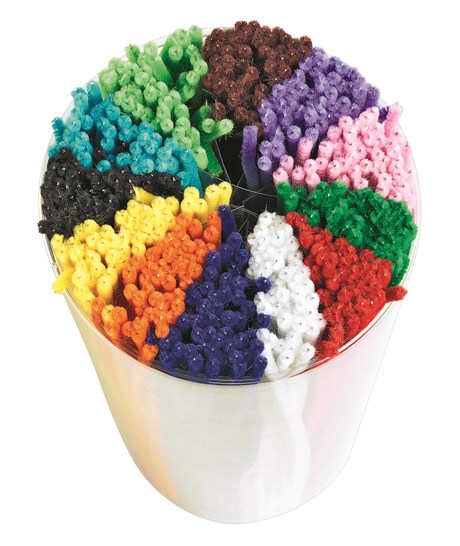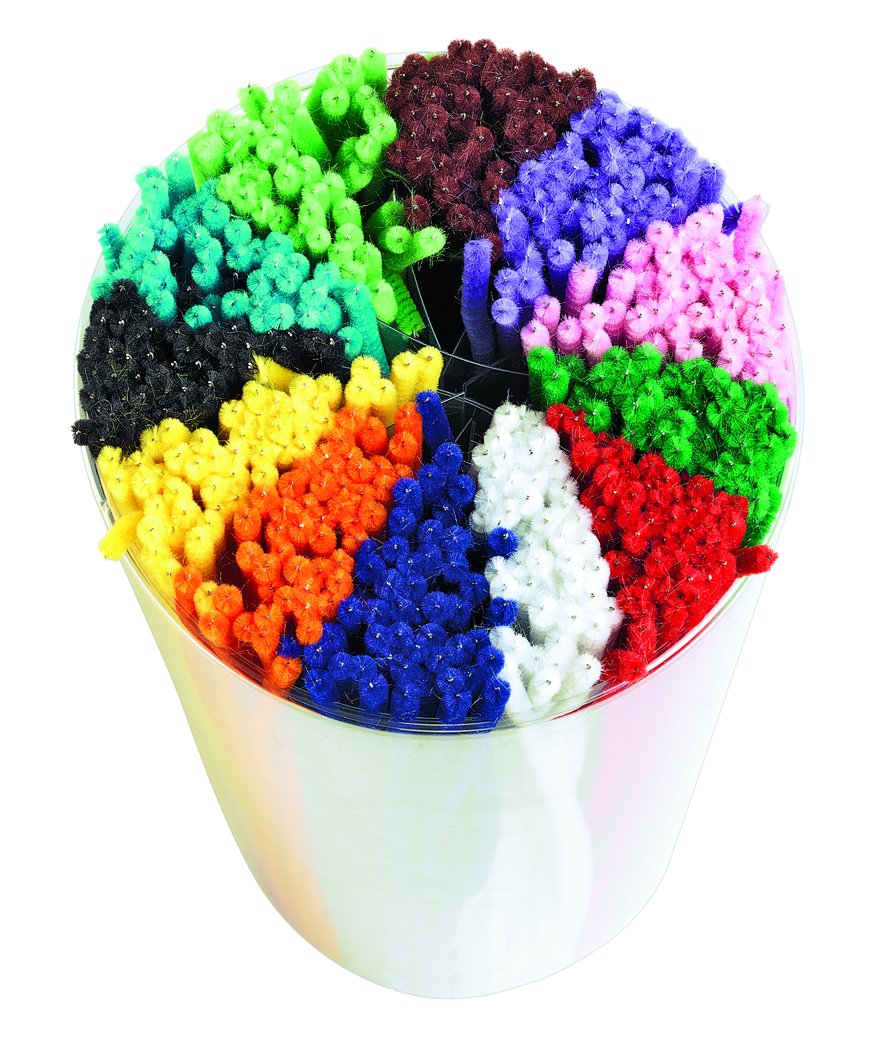 Un pratico barattolo cilindrico pieno di un incredibile assortimento di ciniglia animata colorata e dotato di divisori. Contiene 50 fili per ciascuno dei 12 colori, per un totale di 600 fili rivestiti di ciniglia. - 600 pezzi in 12 colori - Lunghezza cm 30 - Diametro cm 0,4 - In pratico barattolo
