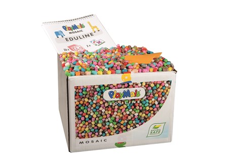 Playmais mosaico confezione scuola: è un gioco ecologico, biodegradabile al 100% che sostiene l'ambiente! E' un prodotto naturale, privo di glutine, mater/Bi (materiale ecologico derivato dal mais) e colorato con colori alimentari atossici. I cilindri di mais possono essere tagliati, compressi, arrotolati e incollati tra loro solo inumidendoli. Sarà l'amido stesso del mais a fare da collante: un prodotto davvero naturale e creativo. E' un materiale molto facile da modellare e permetterà ai bambini di cimentarsi con grande fantasia e manualità. rispetto al Playmais Classico, le dimensioni ridotte del Playmais Mosaico ne garantiscono una maneggevolezza ancora maggiore e offrono l'opportunità di realizzare creazioni in 2D sempre più precise e definite. In tutte le confezioni sono incluse schede con campiture colorate, numerate a seconda della tinta, che il bambino dovrà ricoprire con i Playmais del colore corrispondente. - Prodotto atossico, privo di glutine - Include 1200 pezzi + 48 sche