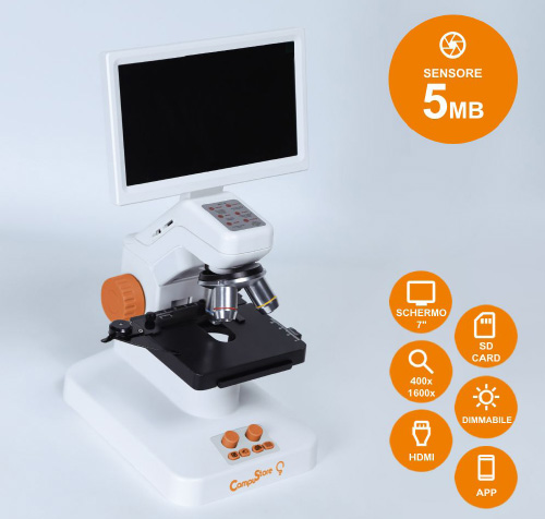 Contenuto: n. 1 microscopio, n. 1 cavo HDMI, n. 1 cavo alim USB, n. 1 confezione con 10 vetrini preparati, n. 1 copertura antipolvere, n. 1 scheda SD 8GB, n. 1 custodia per il trasporto.